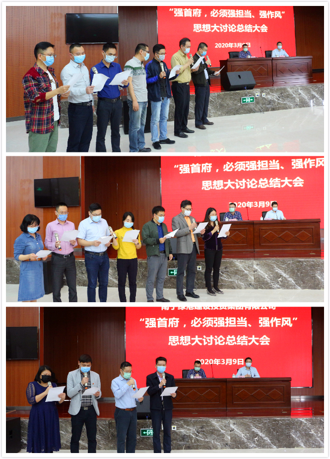 最后,集團黨委書記、董事長龔國強對本次思想大討論活動開展情況進行了總結(jié)點評,并要求各部門、各子公司認真踐行諾言,落實落細措施,確保取得良好成效。龔書記表示,當(dāng)前疫情形勢依然嚴峻復(fù)雜,全國各地都在做好疫情防控的前提下,出臺了一系列政策措施,搶開局、穩(wěn)經(jīng)濟、促發(fā)展。綠港集團在疫情防控的關(guān)鍵時刻召開這次總結(jié)會,就是要進一步營造一心一意謀發(fā)展的濃厚氛圍,形成全力以赴落實強首府戰(zhàn)略的強烈共識,傳遞出疫情防控和經(jīng)濟發(fā)展兩手抓、兩手都要硬的鮮明導(dǎo)向和強烈信號,為實現(xiàn)集團公司高質(zhì)量發(fā)展的“加速度”,全力以赴完成好新的一年集團公司的各項發(fā)展任務(wù)目標(biāo)。作為經(jīng)開區(qū)最大的平臺公司,2020年年初以來,綠港集團緊緊圍繞“強首府,必須強擔(dān)當(dāng)、強作風(fēng)”的總體要求,著重在“學(xué)精神、查不足、求改變、強擔(dān)當(dāng)”上下功夫,針對如何解決六個方面突出問題、如何克服十種突出現(xiàn)象以及如何在八種情形下運用容錯糾錯機制,結(jié)合工作實際,群策群力開展了三次專題思想大討論活動,通過查深、查透、立行立改,有力轉(zhuǎn)變了作風(fēng),進一步提高了干部職工的緊迫感、使命感,為全面落實強首府戰(zhàn)略,奮力譜寫集團公司高質(zhì)量發(fā)展新篇章凝聚了共識,集聚了動力。
