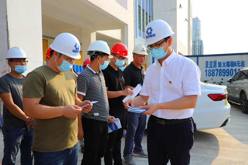 綠港集團黨委副書記、總經(jīng)理鄧繼慧給項目一線人員發(fā)放《工程建設廉政手冊》(張彩秀 攝)