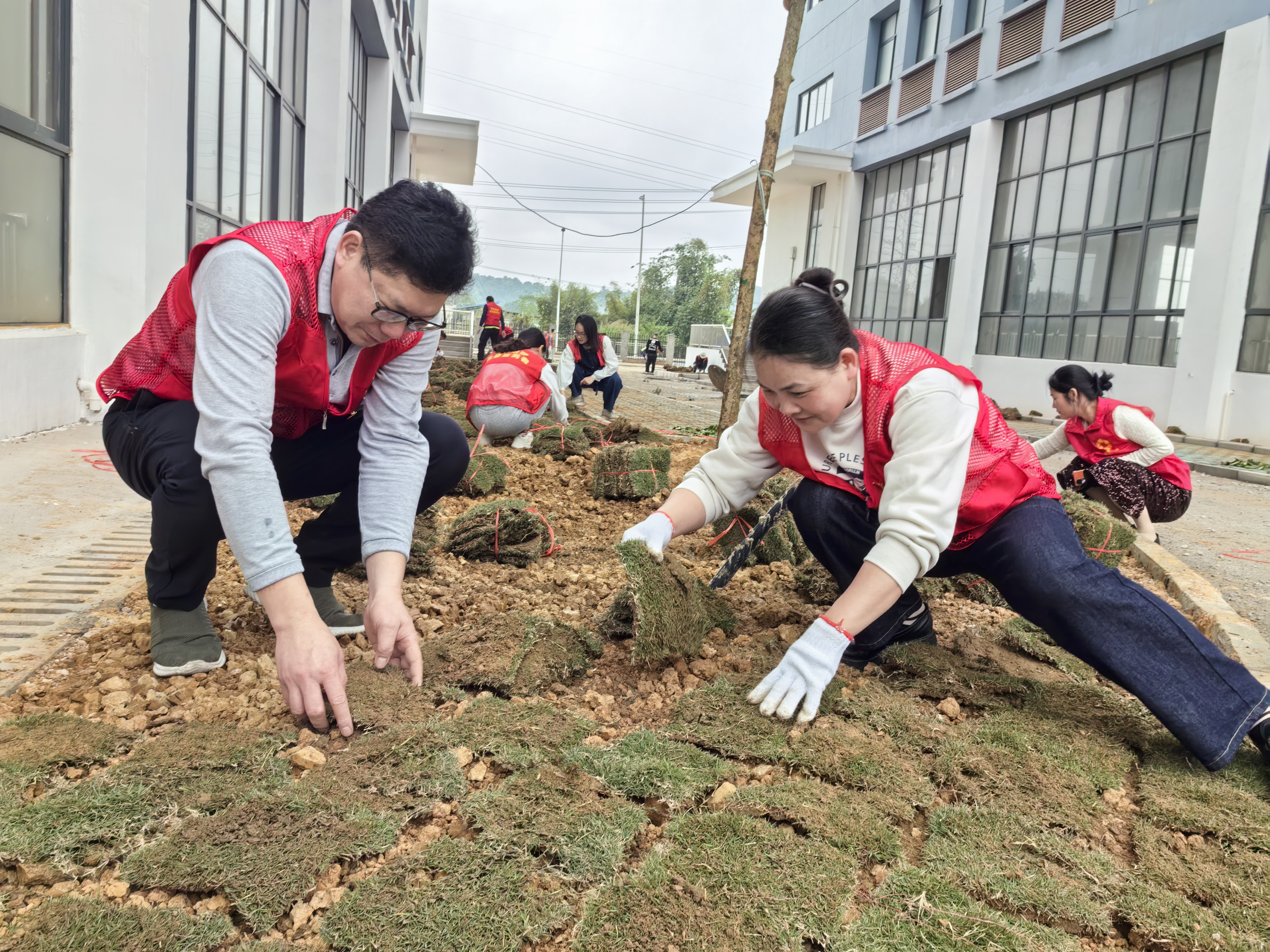 “這棵樹(shù)苗要扶正,不然長(zhǎng)大后會(huì)歪的?!?/span>榮鑫公司黨支部委員、副總經(jīng)理唐欽月一邊指導(dǎo)身邊的同事,一邊用腳輕輕踩實(shí)樹(shù)苗周圍的泥土。她笑著說(shuō):“植樹(shù)就像培養(yǎng)孩子,一開(kāi)始就要打下好基礎(chǔ)?!?/span>她的臉上掛著汗珠,但眼神中滿是認(rèn)真。不遠(yuǎn)處,年輕的入黨積極分子楊文君正和同事們一起鋪設(shè)草皮。他們動(dòng)作熟練,配合默契,不一會(huì)兒就鋪出了一大片嫩綠的草地。楊文君擦了擦額頭的汗水,笑著說(shuō):“今天雖然累,但看到這片新綠,心里特別踏實(shí)。作為入黨積極分子,能和黨員們一起為生態(tài)環(huán)境出一份力,感覺(jué)特別有意義。”